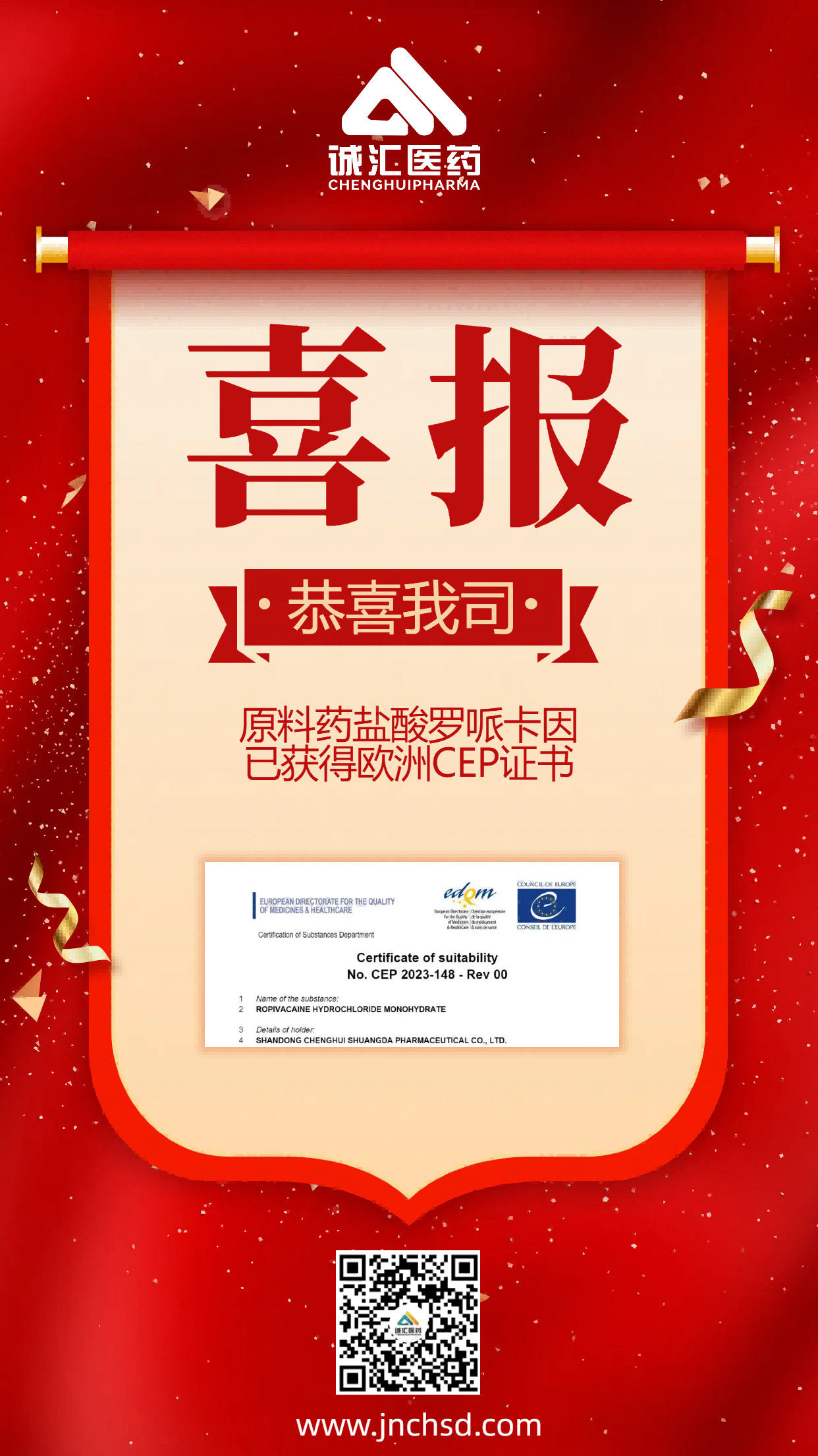 Our company has submitted the registration declaration of many products in Europe, America and other countries, and more products will be registered internationally in the future. The company will take this European CEP certificate as a new starting point, consolidate the foundation, innovate, base on the present and create the future! We firmly believe that the company will have more products through the international registration, to help the company's API business development and create a new situation in the international competition!