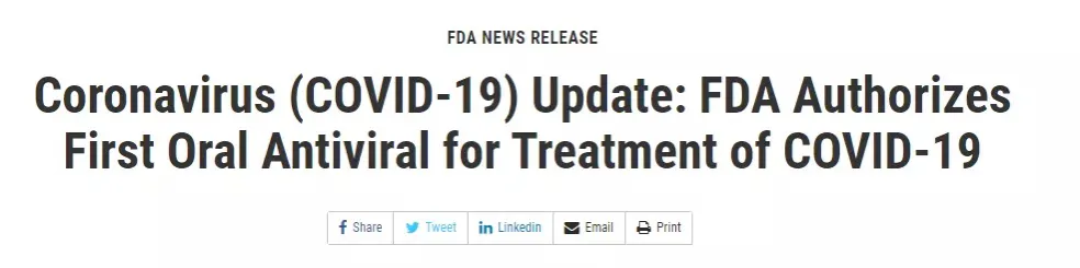12月22日,輝瑞宣布美國FDA已批準(zhǔn)其新型COVID-19口服抗病毒候選藥物Paxlovid 的緊急授權(quán)申請(EUA),用于治療非住院、具有發(fā)展成重癥疾病高風(fēng)險的輕中度、12歲及以上兒童和成人COVID-19感染患者。